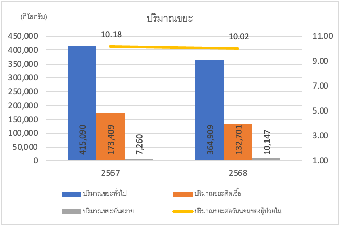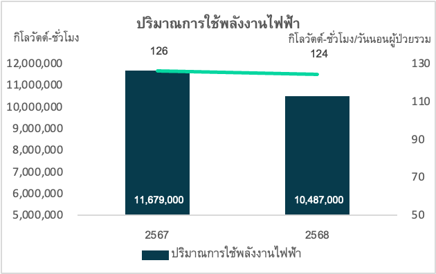 | แนวทางการบริหารจัดการ และผลการดำเนินงาน | การจัดการขยะและของเสีย การจัดการขยะและของเสียถือเป็นบริบทที่สำคัญต่อการประกอบกิจการด้านสถานพยาบาล ทางโรงพยาบาลได้มีการแต่งตั้งคณะกรรมการจัดการขยะและของเสีย เพื่อให้เกิดความสะดวกรวดเร็วต่อการจัดการและการกำจัดได้อย่างถูกต้อง และมีการตรวจติดตาม การแยกทิ้ง การจัดเก็บ การรวบรวม การเคลื่อนย้าย ขนส่งและการกำจัดมูลฝอย 1. กำหนดนโยบายการคัดแยกขยะตั้งแต่ต้นทาง โดยแบ่งประเภท ภาชนะบรรจุพร้อมสัญลักษณ์ และสีของถังที่บรรจุชัดเจน และมีการจัดอบรมเรื่องเกี่ยวกับการคัดแยกขยะ นอกจากนี้ในการกำจัดขยะติดเชื้อและขยะอันตราย ถูกทำลายด้วยเตาเผาอุณหภูมิสูง ซึ่งอุณหภูมิไม่ต่ำกว่า 760 องศาเซลเซียส และ 1,000 องศาเซลเซียส ซึ่งเป็นไปตาม กฎกระทรวงว่าด้วยการกำจัดขยะมูลฝอยติดเชื้อ พ.ศ. 2545” ของกระทรวงสาธารณสุข และ “ข้อบังคับกรุงเทพมหานคร ว่าด้วยหลักเกณฑ์การจัดการมูลฝอย และสิ่งปฏิกูลของอาคาร สถานที่ และสถานบริการสาธารณสุข พ.ศ. 2545” ผลการดำเนินงาน ปี 2568 ![]() ในปี 2568 มีปริมาณขยะติดเชื้อต่อจำนวนผู้ป่วยในเฉลี่ย 10.02 กิโลกรัมต่อวัน ลดลง 0.16 กิโลกรัมต่อวัน เมื่อเทียบกับปี 2567 เท่ากับ 10.18 กิโลกรัมต่อวัน ในปี 2568 โรงพยาบาลมีจำนวนคนไข้ที่ลดลงส่งผลให้จำนวนขยะลดลงตามจำนวนคนไข้ที่ลดลง และมีปริมาณขยะรีไซเคิล 59,119 กิโลกรัม โดยบริษัทได้นำส่งต่อกับสถานที่รับซื้อขยะรีไซเคิล เพื่อนำไปรีไซเคิล และรายได้ที่ได้รับจากการจำหน่ายขยะรีไซเคิล จำนวน 143,817 บาท บริษัทได้จัดเก็บไว้เพื่อทำกิจกรรมเพื่อสิ่งแวดล้อมและสังคม ในปี 2569 การใช้พลังงานไฟฟ้า บริษัทดำเนินการลดการใช้พลังงานไฟฟ้าอย่างเข้มข้น ตั้งแต่ปี พ.ศ. 2541 ดังจะเห็นได้จาก การคว้ารางวัลอาคารอนุรักษ์พลังงานดีเด่น ของกรมพัฒนาและส่งเสริมพลังงานกระทรวงวิทยาศาสตร์เทคโนโลยีและสิ่งแวดล้อม และได้เห็นความสำคัญของพลังงานอย่างต่อเนื่องเรื่อยมา ในปี 2568 บริษัทได้ดำเนินมาตรการด้านพลังงานที่สำคัญ ดังนี้