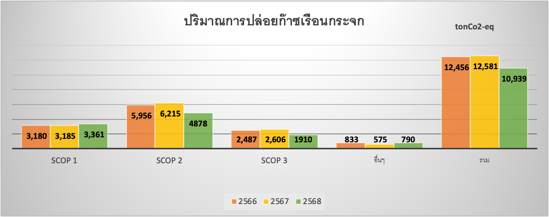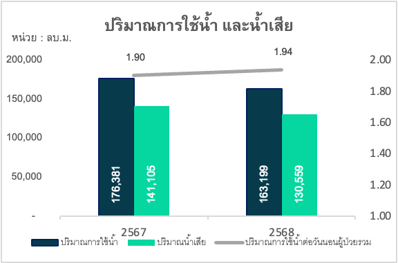 การบริหารจัดการน้ำ และน้ำเสีย การจัดการน้ำเสีย การลดปริมาณการใช้น้ำ ผลการดำเนินงาน 2568 ![]() ในปี 2568 โรงพยาบาลมีปริมาณการใช้น้ำลดลง จำนวน 13,182 ลบ.ม. เมื่อเทียบกับปี 2567 แต่เมื่อคำนวณปริมาณการใช้น้ำต่อวันนอนของผู้ป่วยรวม เท่ากับ 1.94 ลบ.ม. เพิ่มสูงขึ้นเล็กน้อย คิดเป็นร้อยละ 2.11 เมื่อเทียบกับปี 2567 เท่ากับ 1.90 ลบ.ม. จากข้อมูลดังกล่าวข้างต้น บริษัทจะดำเนินการจัดหาแนวทางเพื่อบริหารจัดการการใช้น้ำให้ได้ตามเป้าหมายที่กำหนด การจัดการก๊าซเรือนกระจก บริษัทได้เริ่มดำเนินการวัดปริมาณการปล่อยก๊าซเรือนกระจกอย่างจริงจัง โดยจัดตั้งคณะทำงานในการเก็บรวมรวมข้อมูล และดำเนินการจัดการหาวิธีการดำเนินกิจกรรมต่างๆ ในการช่วยลดการปล่อยก๊าซเรือนกระจกของกิจกรรม โดยในช่วงต้นปี 2568 บริษัทได้สมัครเข้าร่วมโครงการทดสอบแพลตฟอร์มคาร์บอนฟุตพริ้นท์ขององค์กร เพื่อมุ่งสู่ Net Zero อย่างเป็นทางการ จากองค์การบริหารจัดการก๊าซเรือนกระจก (องค์การมหาชน) ผลการดำเนินงาน 2568 ![]() จากผลการดำเนินงานในปี 2568 เทียบเป้าหมายระยะสั้นที่จะลดปริมาณการปล่อยก๊าซเรือนกระจก ร้อยละ 2 (เทียบปี 2567) ได้ร้อยละ 13.05 ดังมีรายละเอียดตามตารางด้านบน ซึ่งบริษัทยังคงให้ความสำคัญในพัฒนาระบบการทำงาน เพื่อให้บรรลุตามเป้าหมายที่กำหนดไว้ ![]()