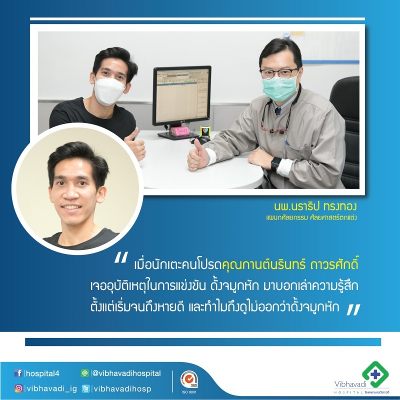 วันที่ 2 ต.ค. 64 มีการแข่งขันฟุตบอลไทยลีก 1 การท่าเรือ เอฟซี พบ เมืองทอง ยูไนเต็ด ในจังหวะนั้นได้มีการขึ้นโหม่งของผมและผู้เล่นของเมืองทอง ทำให้ศีรษะของผู้เล่นทีมเมืองทองได้กระแทกมาที่จมูกของผม หลังจากนั้นก็ล้มลงและมีเลือดไหลบริเวณจมูก อาการในตอนที่ล้มลงก็คือ รู้สึกชา ยังไม่เจ็บเท่าไร แต่รู้ว่ามีเลือดไหลออกมาเยอะมาก ลืมตาไม่ขึ้นเพราะเลือดไหลเข้าตา แต่พอสักพักเริ่มรู้สึกปวดบริเวณที่โดนกระแทกมากขึ้นเรื่อยๆ ความรู้สึกแรกที่หมอวินิจฉัยก็แอบตกใจว่าเป็นเยอะเหมือนกันนะ แต่ก็ไม่ได้กังวลมาก เพราะทำใจมาบ้างแล้วว่าจมูกหัก ที่กังวลตอนแรกก็คือกลัวเรื่องสมองกับตาจะได้รับผลกระทบ พอหมอวินิจฉัยว่ามีแค่ส่วนจมูกที่ได้รับบาดเจ็บและมีแผลฉีกไปถึงหน้าผากนิดนึงก็รู้สึกโอเคขึ้น หลังผ่าตัดรู้สึกดีขึ้นมาก เพราะหมอแจ้งว่าการผ่าตัดเป็นไปด้วยดีไม่มีอะไรน่าเป็นห่วง อยากให้ผู้ที่ประสบอุบัติเหตุลักษณะนี้ไม่ต้องกังวลจะรักษาที่ไหนก็ตาม ขอให้เชื่อมั่นในการรักษาของหมอนะครับและควรเป็นหมอเฉพาะทางด้วยจะดีที่สุดครับ ผมโชคดีที่ได้มาที่โรงพยาบาลวิภาวดี เพราะมีทีมแพทย์ที่เก่ง รักษาได้รวดเร็วและมีผลลัพธ์ที่ดี ประทับใจในการดูแลของคุณหมอที่ให้คำปรึกษาทั้งก่อนและหลังผ่าตัด ทำให้รู้สึกผ่อนคลาย ไม่กังวลกับการรักษา หมอเย็บแผลได้สวยมาก และทีมแพทย์ที่ดูแลตลอดการพักฟื้นที่โรงพยาบาลวิภาวดีดูแลเป็นอย่างดี ขอบคุณครับ