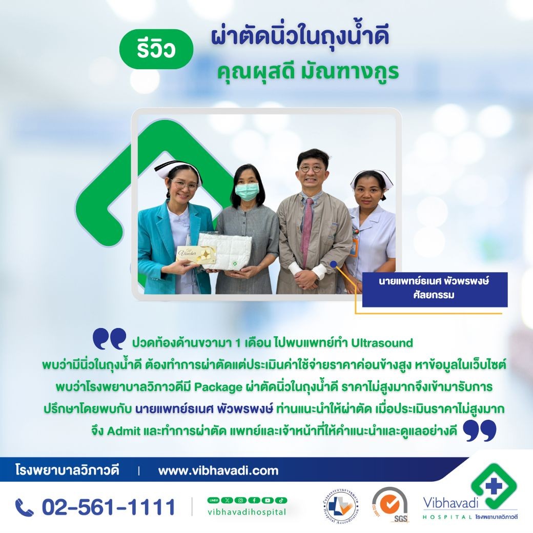 ปวดท้องด้านขวามา 1 เดือน ไปพบแพทย์ทำ Ultrasound พบว่ามีนิ่วในถุงน้ำดี ต้องทำการผ่าตัดแต่ประเมินค่าใช้จ่ายราคาค่อนข้างสูง หาข้อมูลในเว็บไซต์พบว่าโรงพยาบาลวิภาวดีมี Package ผ่าตัดนิ่วในถุงน้ำดี ราคาไม่สูงมากจึงเข้ามารับการปรึกษาโดยพบกับ นายแพทย์ธเนศ พัวพรพงษ์ ท่านแนะนำให้ผ่าตัด เมื่อประเมินราคาไม่สูงมากจึง Admit และทำการผ่าตัด แพทย์และเจ้าหน้าที่ให้คำแนะนำและดูแลอย่างดี